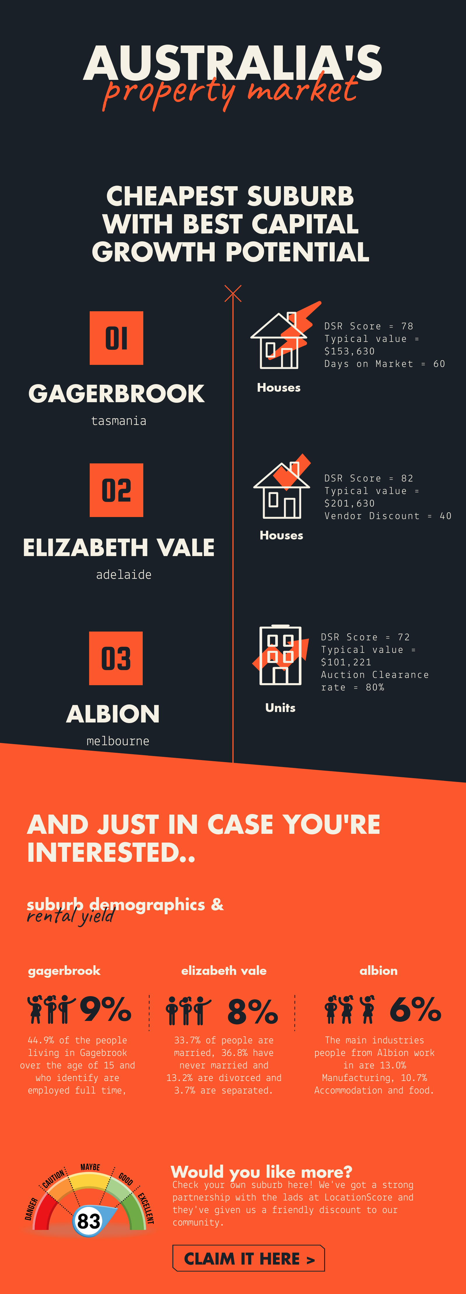 LocationScore is an online residential property research tool. Its goal is to help subscribers pick better locations to buy property, where demand is strong and supply is low. It does this by tracking 8 key variables on a monthly basis and combining the results into a proprietary algorithm to score both houses and units out of 100. The higher the score the better the potential for shorter term capital growth.
